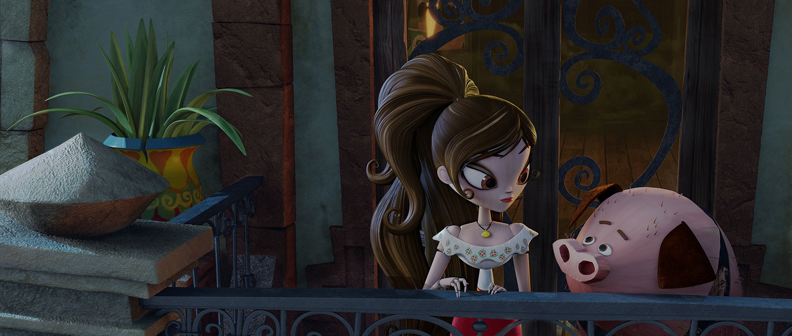 Les textures utilisées pour les personnages sont magnifiques, avec une finesse des détails impressionnante et l’animation joue bien sur leur côté pantin, ce qui donne régulièrement lieu à des scènes un peu cartoon. Les décors sont quant à eux chatoyants de couleurs, pour un univers riche et un style suitant le Del Toro de toutes parts. Mais tout cela reste bien peu face au monde de La Muerta, qui est la véritable explosion graphique du film. Contrairement au traitement visuel de Tim Burton dans son Corpse Bride, l’équipe du film a clairement profité du côté festif autour de la mort pour nous offrir une avalanche de couleurs et de fête.